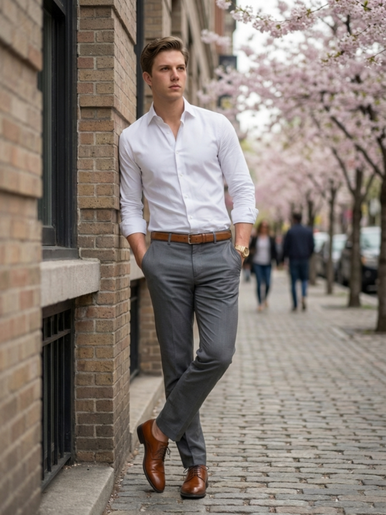 A white button-down shirt is a cornerstone of any strong business casual wardrobe. It’s clean, versatile, and works effortlessly across seasons, especially in spring when lighter tones feel more natural and refreshing.
