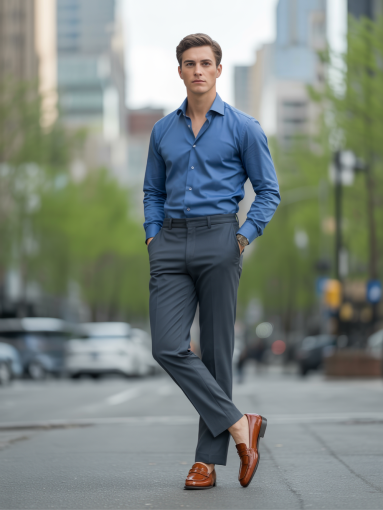 This combination works especially well when you want to look put-together without going overly formal. The contrast between the cool blue shirt and darker trousers creates a clean, balanced appearance that suits both office settings and after-work plans.