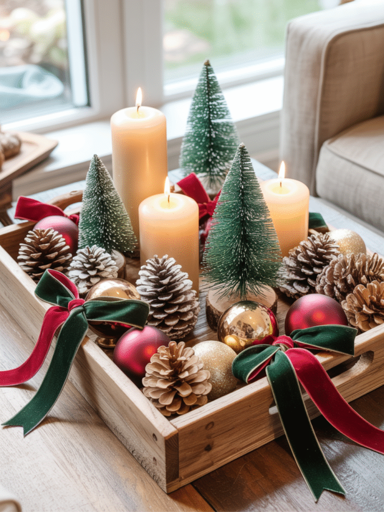 Start with a wooden tray as your base. The natural grain instantly adds depth and authenticity, making it the ideal foundation for layering holiday elements. Arrange pillar candles in cream and deep red for a rich, glowing centerpiece. Surround them with pinecones, mini evergreen trees, and tiny wrapped gifts to create dimension and evoke that nostalgic holiday feeling.