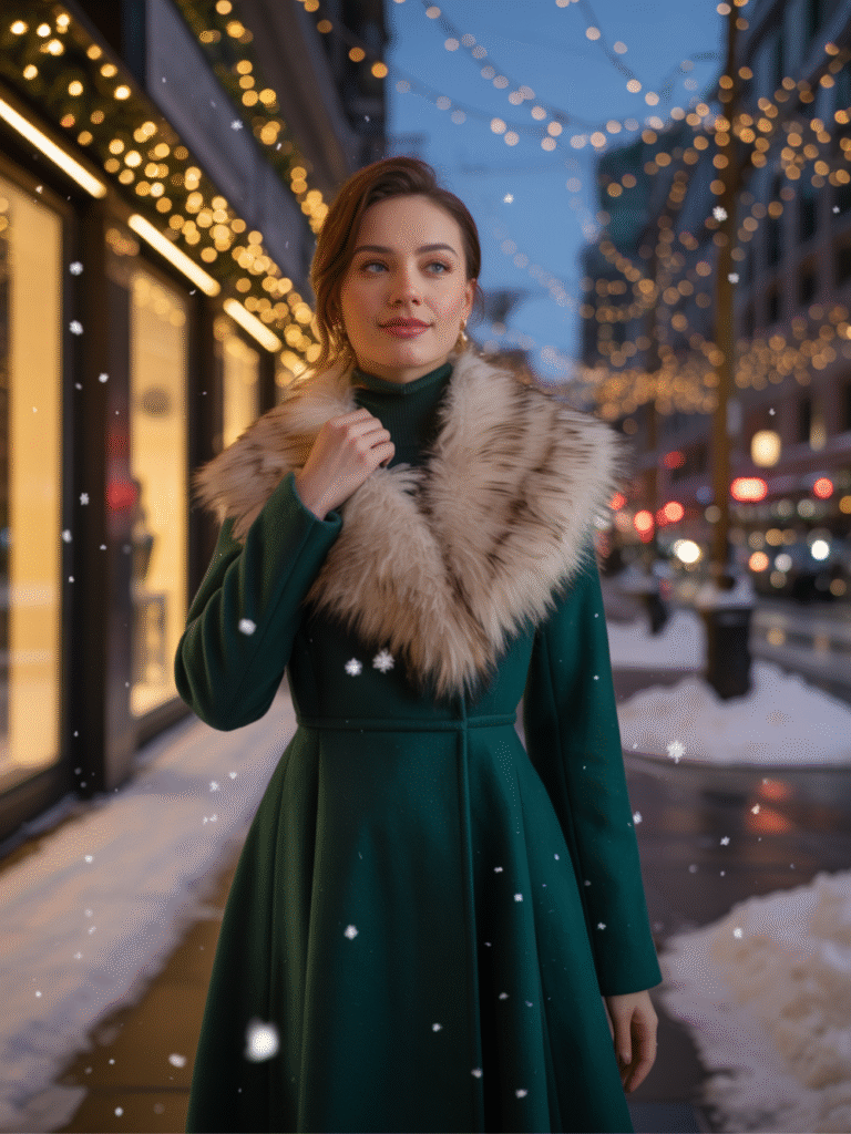 This look is ideal if you want a festive ensemble that feels practical and refined. It keeps you warm, photographs beautifully against winter backdrops, and communicates confidence with every step. A cozy but stylish coat dress with a faux-fur collar lets you enjoy the magic of the season while looking perfectly put together for any holiday occasion.
