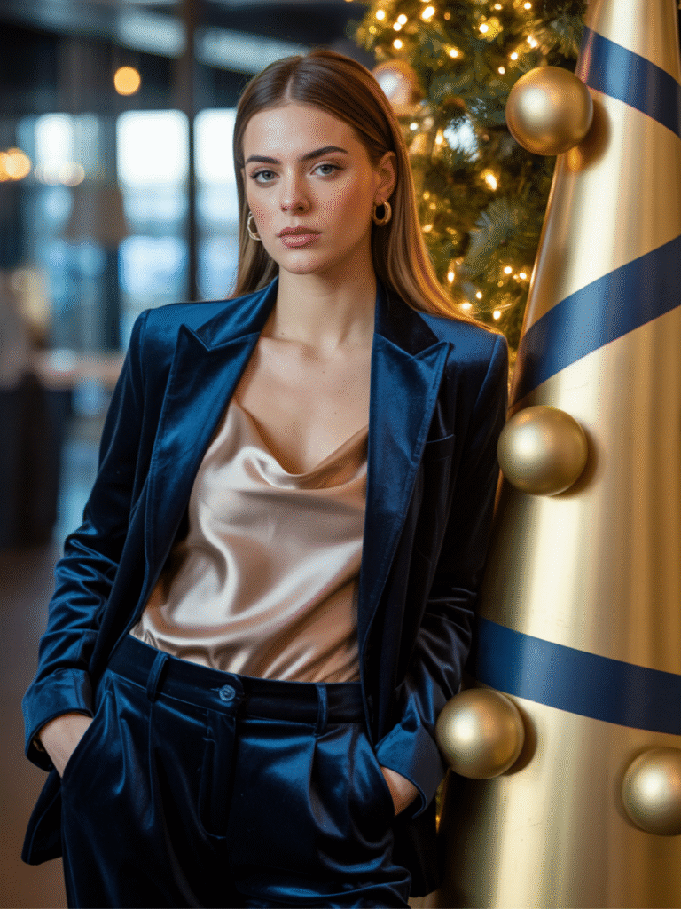 Pants can feel just as festive as a dress when you choose the right fabrics and details. Velvet is a perfect option for holiday events. It adds instant luxury and stands out beautifully under party lighting. A blazer and tailored trousers in a matching deep tone create a sleek and polished silhouette.