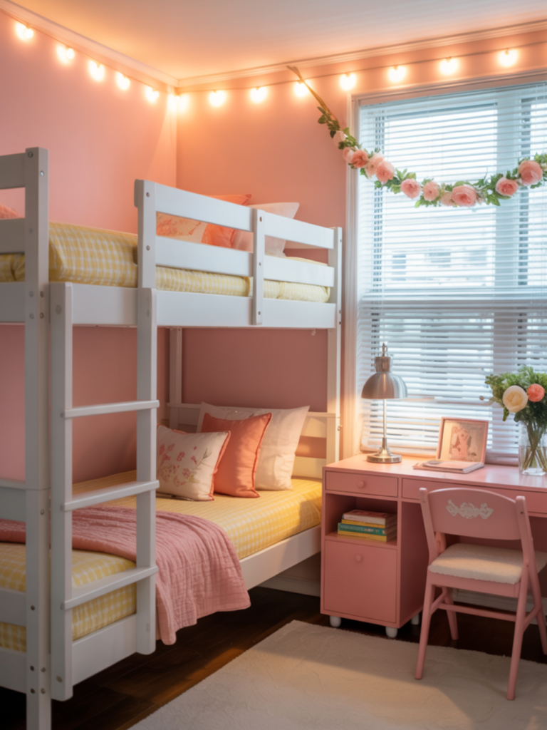 Floral accents bring warmth and softness to a girl’s bunk bedroom, making it feel personal and inviting. When paired with white bunk beds, floral bedding, and garlands, it adds charm without overpowering the space. This style is ideal for girls who enjoy a cozy, cottage-inspired look.