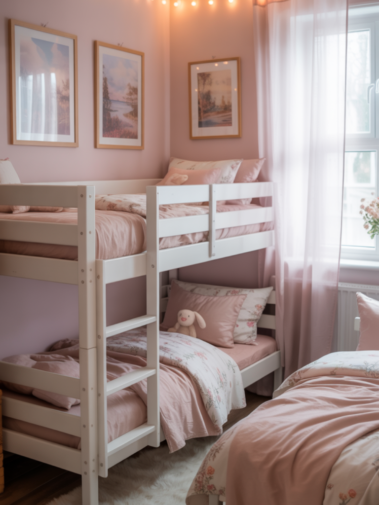 A dreamy girl’s bunk bedroom, designed with soft pastels, creates a peaceful environment that supports rest and relaxation. Blush pink and lilac tones work beautifully together, especially when paired with natural light and sheer curtains that soften the room throughout the day.